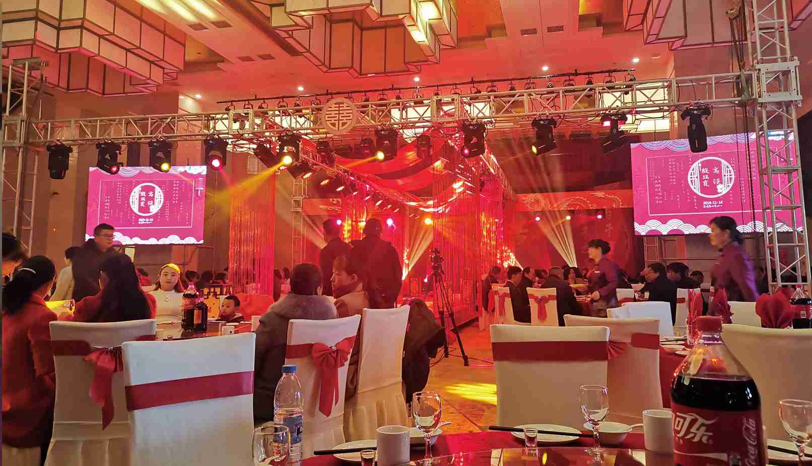 公司員工婚禮現(xiàn)場(chǎng),完全由公司內(nèi)設(shè)計(jì),搭建,布展。電腦光束燈,線陣音響,LED屏及舞臺(tái)、TURRS架均為公司提供