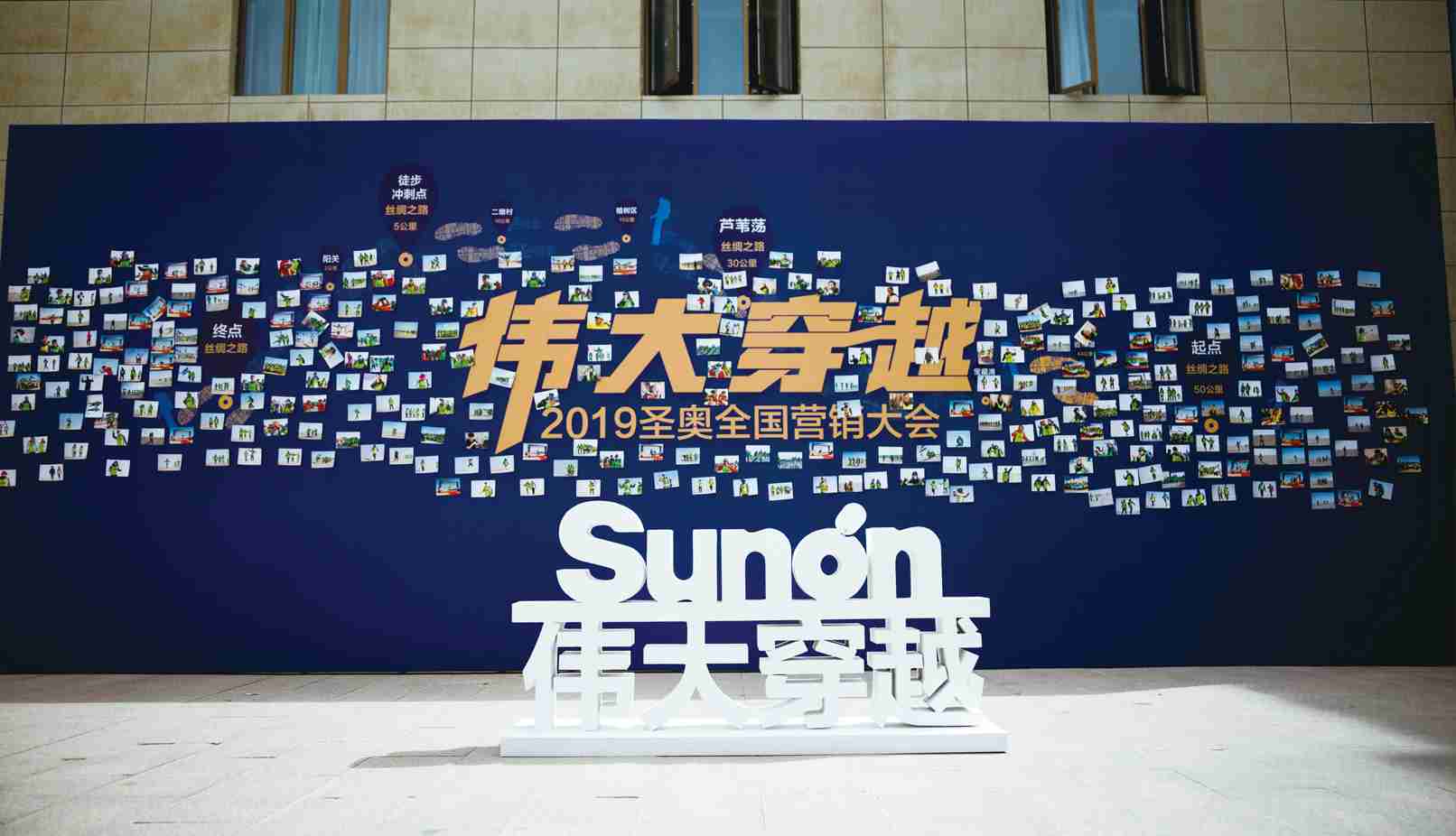 偉大穿越-2019圣奧全國(guó)營(yíng)銷(xiāo)大會(huì),戶(hù)外木質(zhì)背板裱寫(xiě)真,立體字,室內(nèi)LED屏搭建,現(xiàn)場(chǎng)畫(huà)面返投。